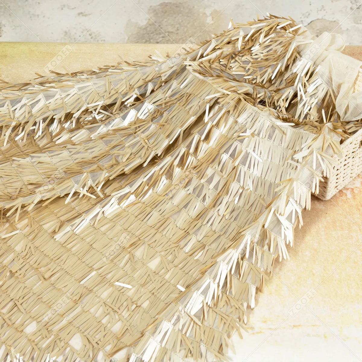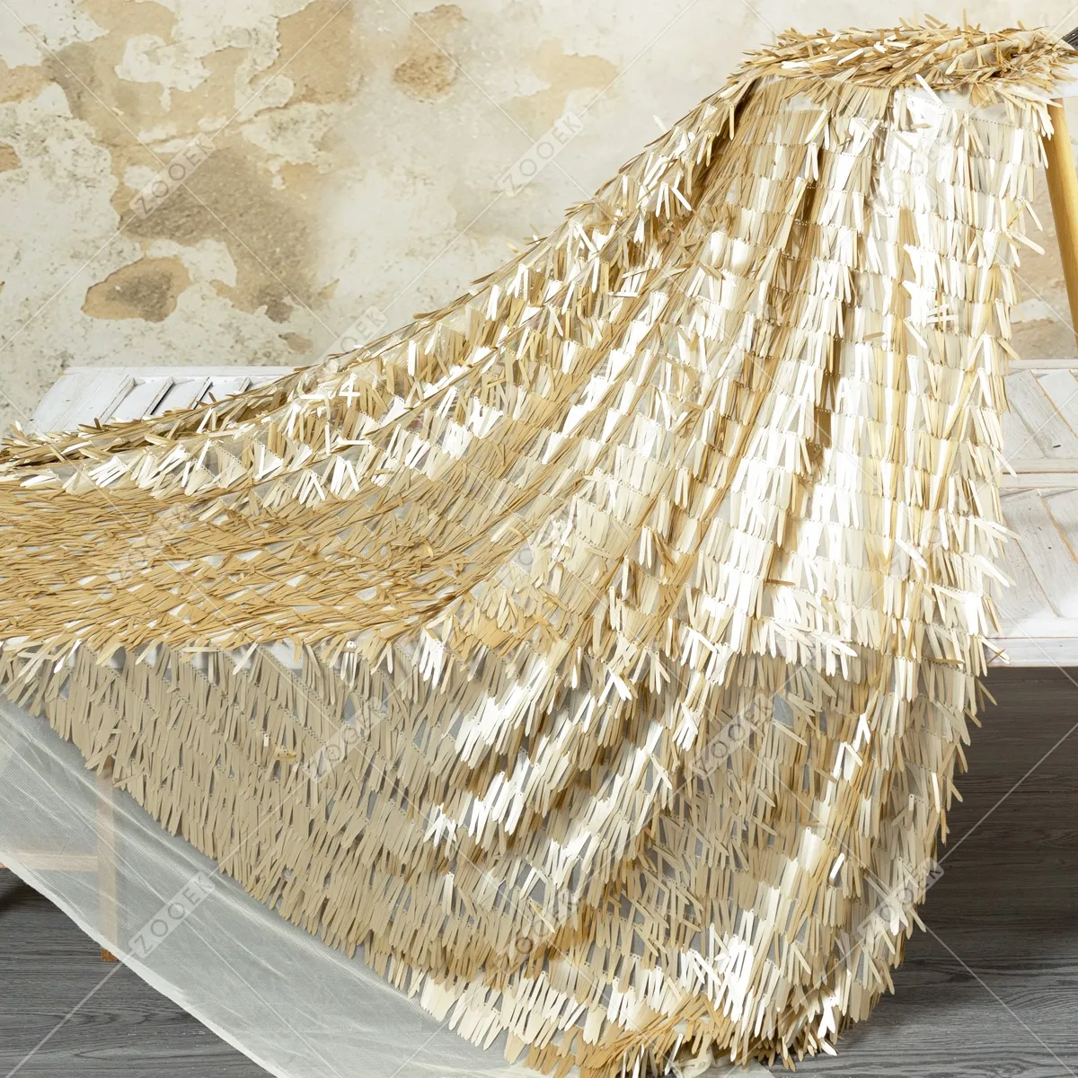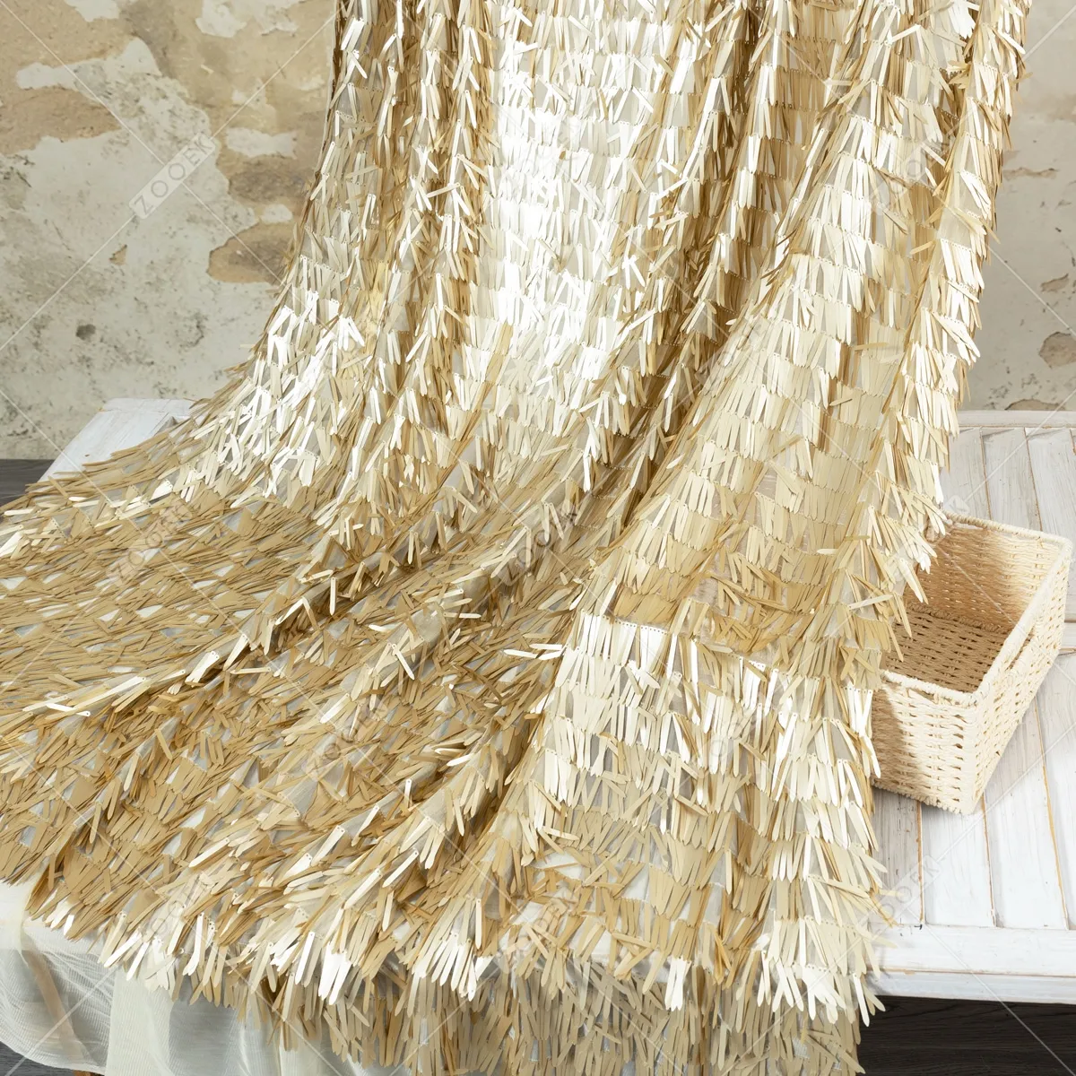 This attractive matte gold fringe piano rectangle sequin fabric boasts impressive dazzle, featuring long-sword pattern matte gold metallic sequins all over on mesh fabric. Perfect for creating costumes, prom dresses, apparel, and more. Sold by the yard.